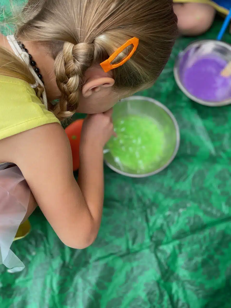 First, I laid out a plastic table cloth on the ground. A kids’ picnic table would have been better for this project. But these kids are extremely flexible, so that worked. We measured out the water, soap and they chose paint colors.