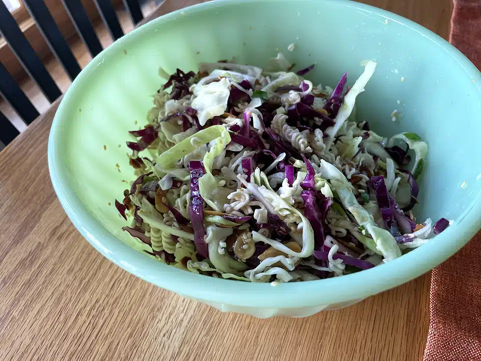 This recipe can be modified to suit your needs or pantry holdings. Replace the almonds with sunflower seeds, if you choose. Any flavor of Ramen Noodles tastes good. Don’t like vegetable oil? Substitute in sesame or extra virgin olive oil. Want more of an Asian flavored salad? Be sure to use rice vinegar instead of white. Running short on time? Buy a bag of ready-made coleslaw instead of slicing the cabbage yourself. Last, want this to be your main instead of side dish? I’ve been told that shredded rotisserie chicken is a delicious addition to this salad.
