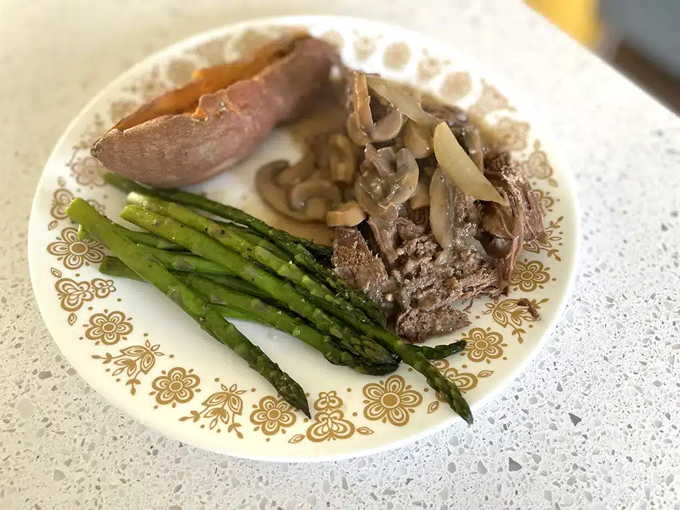 To plate, ladle out the gravy with mushrooms over the venison loin. I served ours with steamed asparagus and baked sweet and russet potatoes.